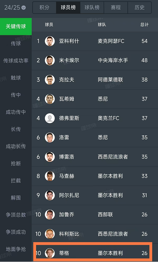第二个,蒂格本赛季状态越来越好,他的2个关键数据也已经排进澳超联赛前10名。在澳超关键传球榜上,蒂格以26次关键传球排在联赛第10位,另外,他还以19次成功传中,排在澳超该榜单的第7位,看得出来,他的视野以及传球能力确实非常出色。