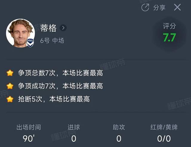 第一个,蒂格3项数据高居全场第一。在这场墨尔本胜利与墨尔本城的德比战中,华裔球员蒂格和黄振文分别代表自己的球队出战,最终双方战成2比2平。蒂格全场争顶总数7次、成功争顶7次、抢断5次,这3项数据都是全场最高,拿下全场第二高7.7分的赛后评分,表现相当抢眼。